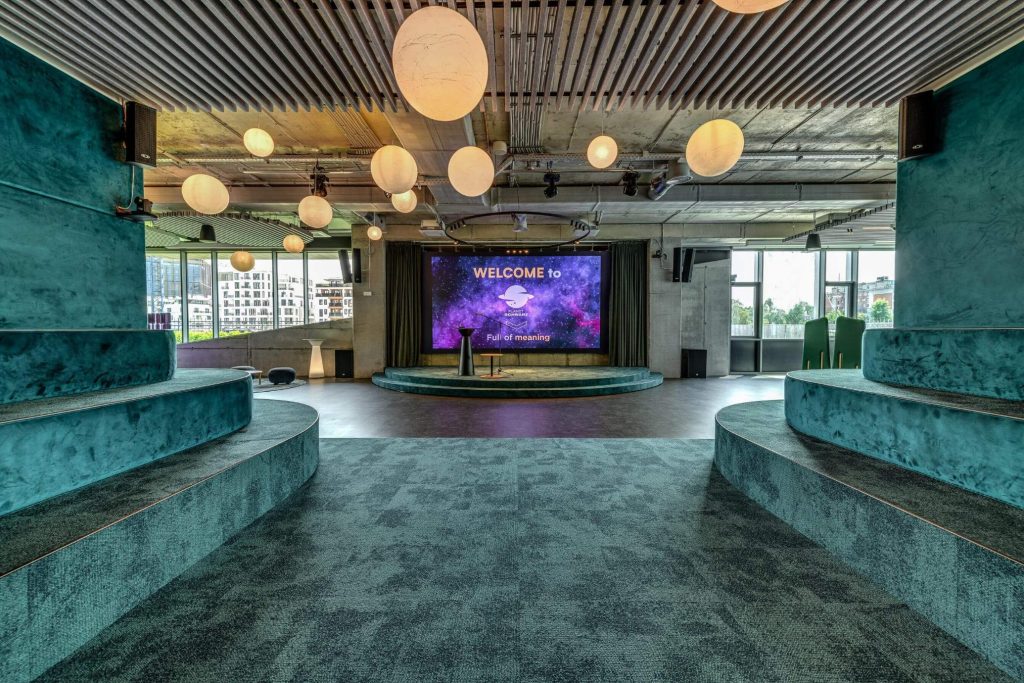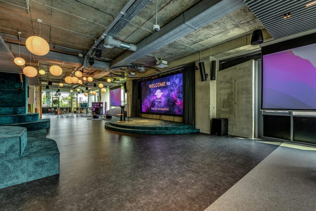 The hall is equipped with sound systems, a 260” video wall, projectors, stage lighting, digital displays, a control monitor, microphones and headsets.